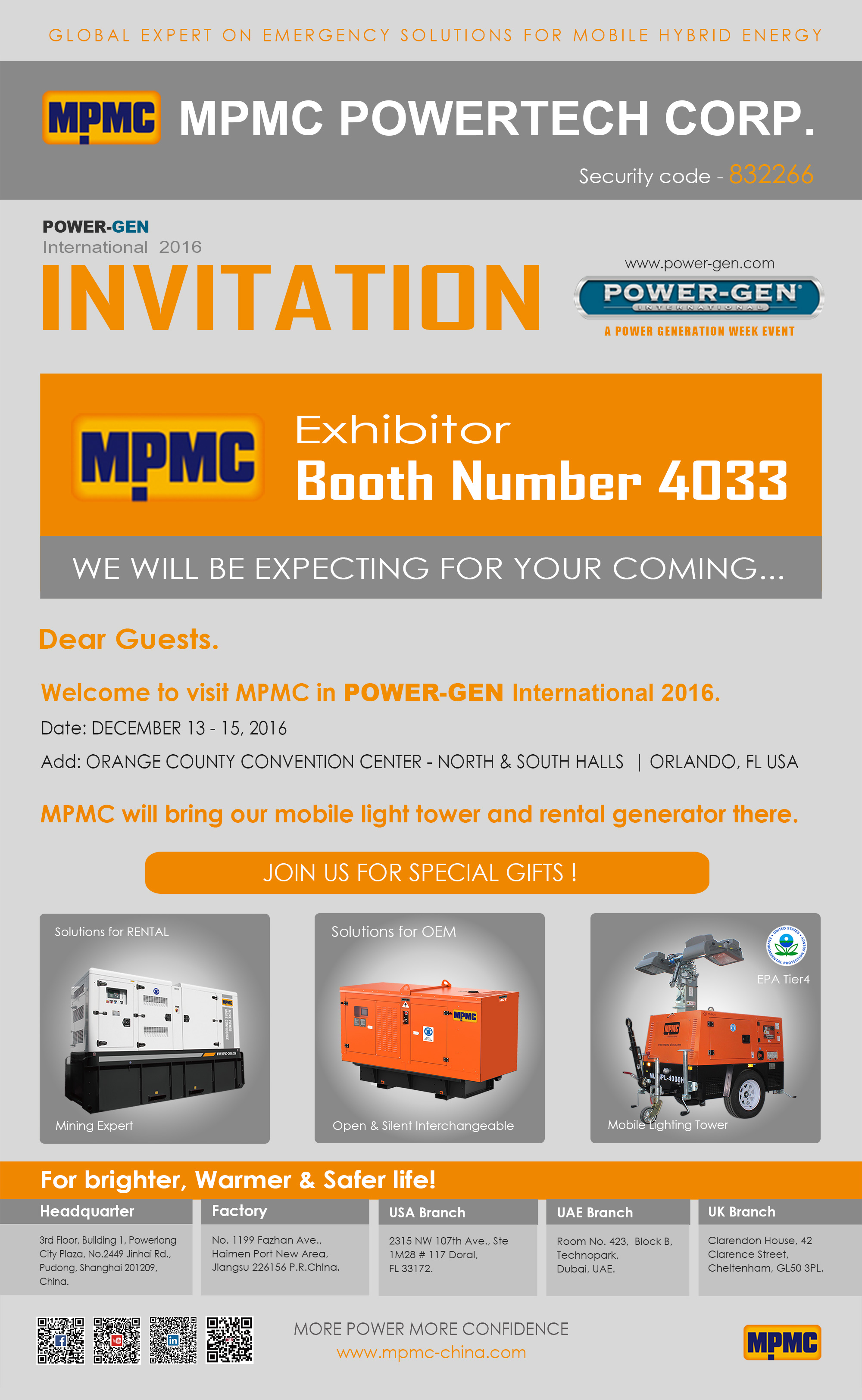 A MPMC Powertech Corp. foi estabelecida em julho de 2008, com foco principal na fabricação e exportaçãode geradores a diesel, torres de iluminação de emergência e produtos de energia híbrida. A MPMC dedica-sea ser um especialista global em soluções de emergência para energia híbrida móvel, que possui 7 patentes de invençãoe 26 patentes de modelo de utilidade. Como nossos importantes parceiros de negócios e clientes, a MPMC convida sinceramentevocê a nos visitar na POWER-GEN International 2016, nosso estande é o número 4033#. Vamos levar nossatorre de luz móvel e gerador tipo aluguel. Tenho certeza de que nossos produtos vão surpreendê-lo!